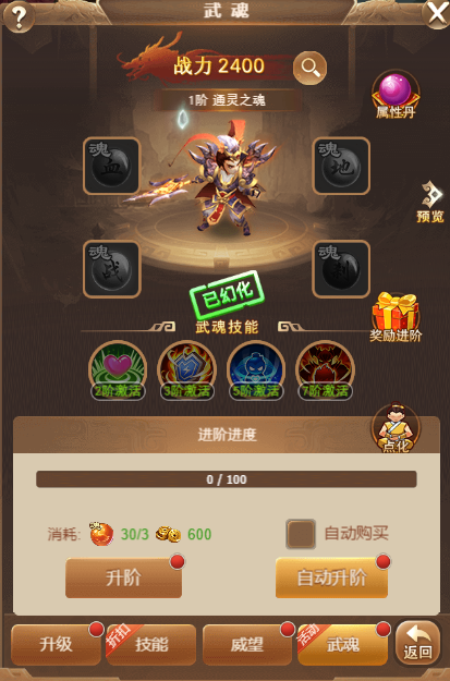 最后就是武魂,此画面中的内容跟威望相符,除了进阶需要消耗武魂进阶丹不同外,其他部分基本一致。