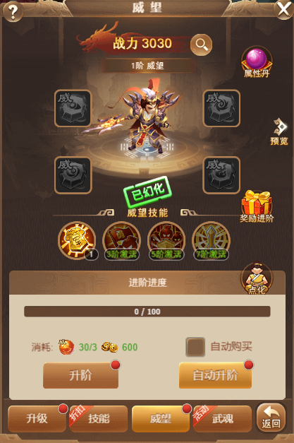 接下来我们看看威望,在画面中有四个【威】字的框框,可以佩戴对应的武将装备,每个装备增加的属性各不相同,随着威望阶级的提升,可佩戴对应阶级的装备。(威望的阶级,可以消耗威望进阶丹和铜钱进行提升)阶级提升后,还能激活威望技能,使自己变得更强,威望有4个技能,每个技能增加的属性也是不一样的,激活后的技能,可以通过对应的技能书,提高技能等级获得大量的属性。