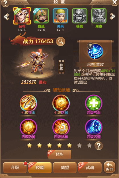 最值得提的一点,每个武将的主技能都是不一样的,有分PVP或者PVE,玩家可以合理的进行搭配,可以使得自己的阵容更强大和实用。品质越高的武将,被动技能的开放个数就越多,像这种属于品质最高的其中之一:吕布ヾ(??▽?)ノ,必须是6个技能啦。