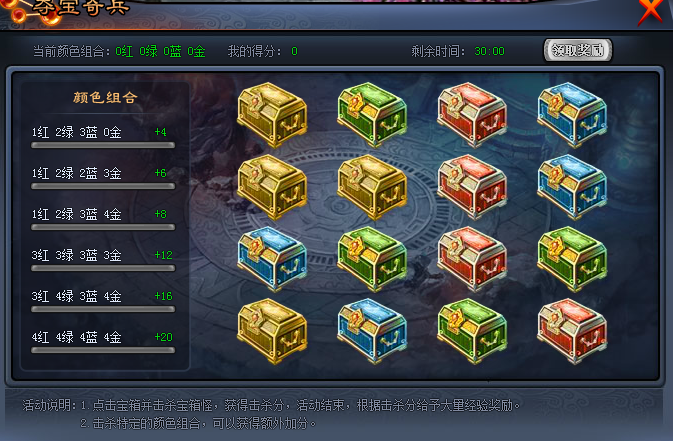 玩家每次达到一个组合时,会有相应的高亮提示,达到较高级别组合时,低级组合的高亮效果消失。颜色组合必须完全匹配。最终玩家获得积分为:消灭宝箱个数*5 + 最终达到的额外积分(最高能获得16*5+20=100分哦)。