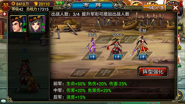 前军生命+50%、攻击伤害-25%、免伤+20%,肉盾一个。中军为物理输出,伤害+20%、策攻免伤+20%,一般就是主角一人。后军为类似魔法攻击的策功输出,速度+15%。玩家可根据自己的战术安排来决定上场阵型。