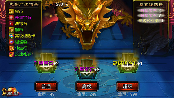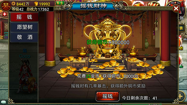 消耗金币产出大量铜币。金币系统会有附送,因此建议每天摇满。