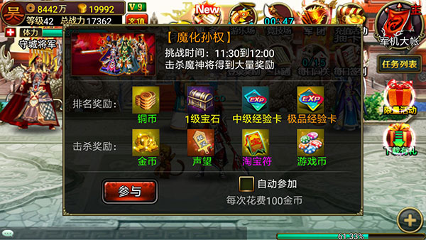 加入军团才可充分体验《三国逍遥记》核心乐趣!每天的守城可要尽量参与哦。