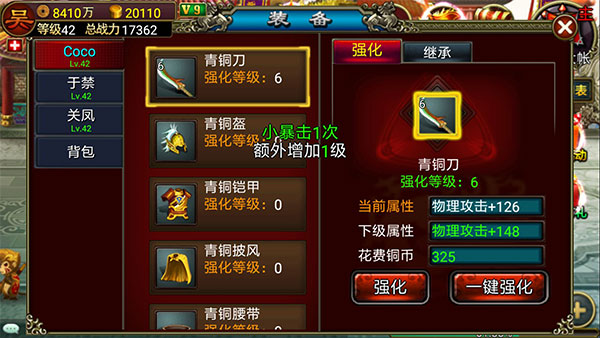 虽然比较消耗铜币,但基本上所有装备都应该升到与级别相近的等级。铜币不够时优先升级武器,其次鞋子与防具。