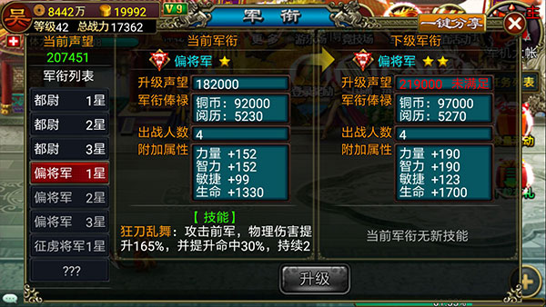 军衔提升主要靠声望,因此要多多参与PK竞技。军衔越高,属性加成越高、俸禄越多、军衔技能越好。