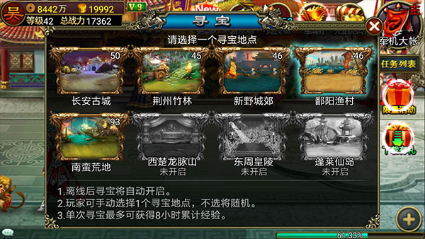 超级福利的低保福利系统!送金币送体力送各种好东西,每日必做!如果时间紧,一些只送1万铜币的任务可以直接忽略。有CD时间的PK类任务也可以忽略。有了每日闯关提供的金币,就可以去摇钱。有了摇钱提供的铜币,就可以尽情强化装备、抽取卡片,战斗力嗷嗷增加。特别要提醒新手玩家的是,第一天要尽量冲到32级激活并完成每日闯关。只靠体力去刷主线和支线任务的话,有的人可能无法达到这一级别。但抢亲、每日问答、寻宝等系统也可以提供大量经验。充分利用的话,第一天冲到32级是没有问题的。