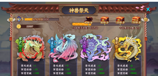 每天进行一次伸神兽祭天,即可轻松地获得军团贡献。