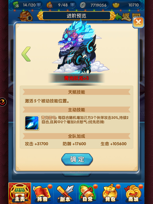 除了斑斓萌虎以外,其他的魔宠系统都会送,龙和凤凰是中午12点和晚上9点的活动,紫极魔在王的男人里面出碎片,回血的狗就是系统给的了,这里要说下,土豪首选老虎,平民首选青光妖龙,每天12点的活动一定要参加,管着在那自动战斗就好了,只有龙和老虎能进阶到红色+3,增加全队属性,而且后期的龙只比老虎差10%的提升,龙是免费给的。
