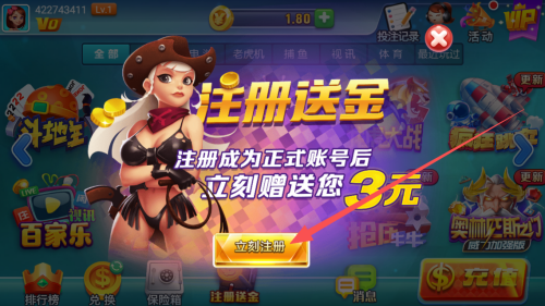 第一步:下载安装空间娱乐手机版本,进入游戏大厅后点击【注册送金】按钮;