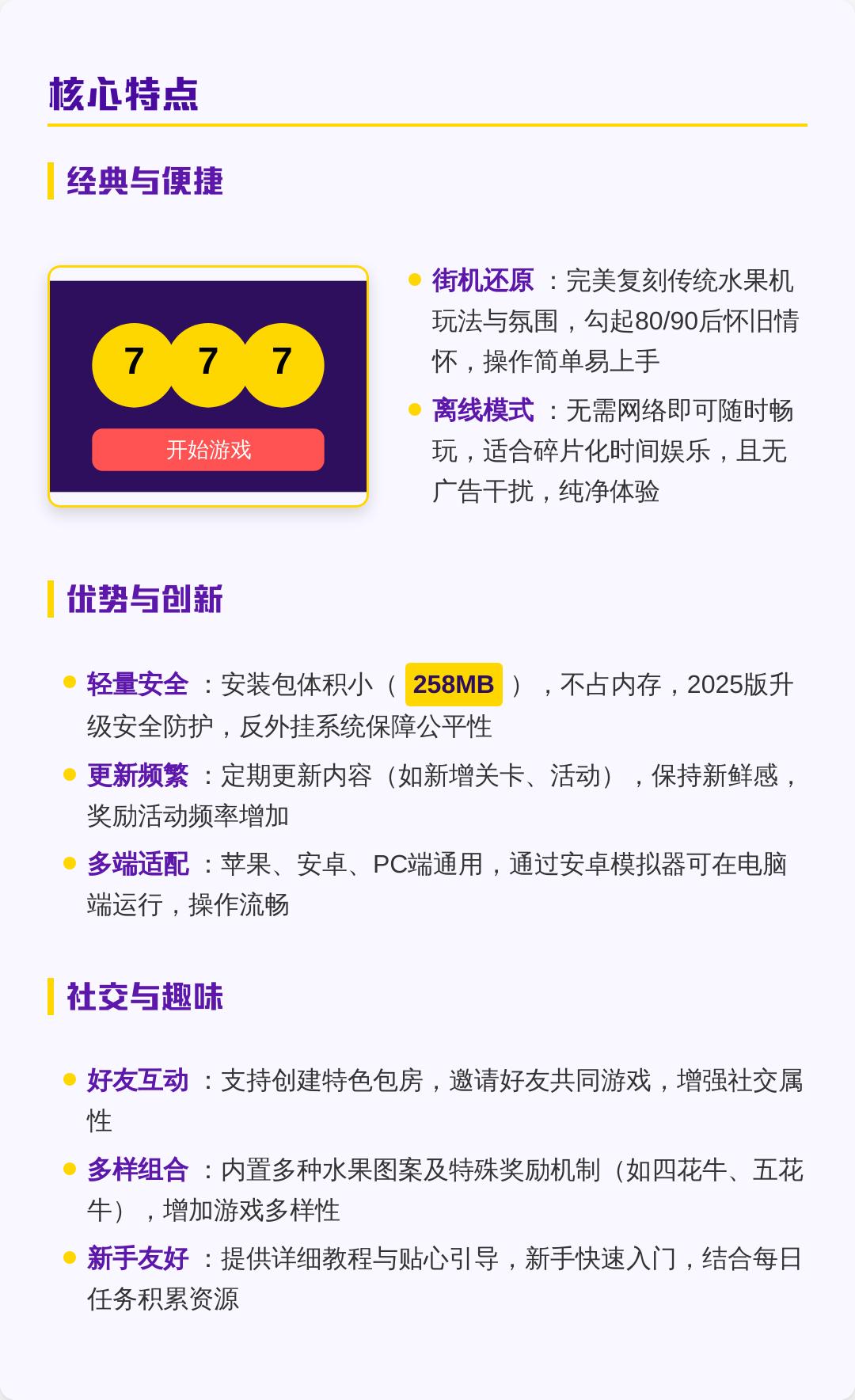 777水果机安装包2025最新——不是一款普通的游戏,而是一台装进口袋的黄金街机!它精准复刻上世纪电玩厅的经典拉霸机神韵,樱桃、葡萄、西瓜、橙子等标志性水果图标跃动于高清卷轴之上,搭配清脆音效与丝滑转盘反馈,瞬间唤醒你的童年记忆。作为纯单机离线版本,无需网络、不耗流量、不绑账号,开机即玩,通勤路上、午休片刻、深夜放松,随时开启一场属于自己的幸运风暴。