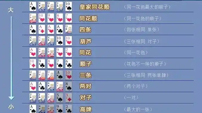 在德州扑克中,比牌时10种牌型从大到小排列,决定胜负。分别是:皇家同花顺、直牌同花顺、四条、平头、葫芦、三条、两对、一对、高牌和小牌。