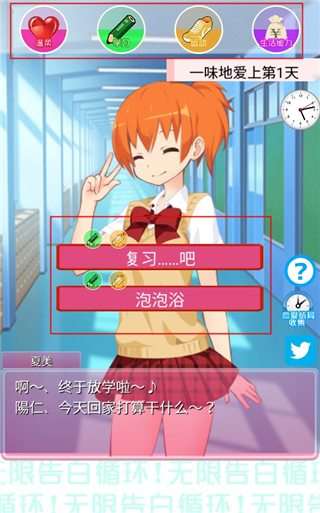无限告白循环中文版是一款炙热的模拟恋爱养成文字剧情手游。在这个游戏中,你将扮演一个阳光帅气的男子高中生,在一座充满日式风情的校园中展开精彩的求学生活。这里有许多性格迥异、美丽动人的少女们等待着你的邂逅!不同于其他恋爱游戏,我们的游戏具有无限的告白循环机制。就算告白失败,又能再来一次,无限挑战不停止!这种奇妙的超选择型恋爱游戏极具刺激感,让你爱情无处不在。
