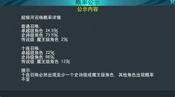 而超银河召唤奖励就比普通银河召唤奖励高了很多,在超银河召唤之中小伙伴们最高可以获得传说级和魔王级英雄,超银河召唤也是分为单次召唤和十连召唤两种,其中单次召唤传说级和魔王级获得几率是2%,十连召唤的传说级和魔王级召唤几率则变成12%,而十连召唤则会必然出现一个至少一个史诗级或魔王级英雄!无论是银河召唤还是超银河召唤都是拥有免费几率的,银河召唤每天可以召唤一次,超银河召唤则需要很长时间等待才能进行刷新!