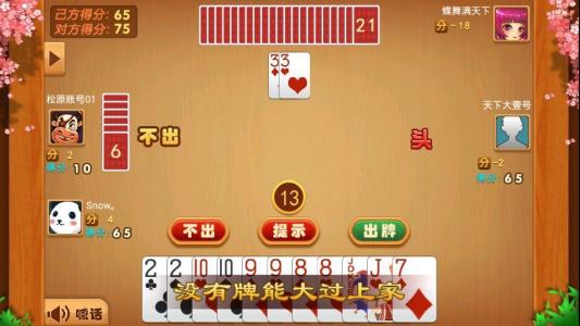 3、游戏者依次轮流出牌,后一家打出的牌必须比前一家打出的牌大,如没有可以弃权。