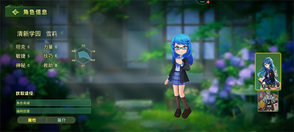 介绍:雪莉是学园中的清新偶像,以灵活的走位和高效的救助能力著称。虽然攻击力平平,但凭借出色的敏捷性(S级)和团队救助技能(B级),成为战场上不可或缺的支援角色。