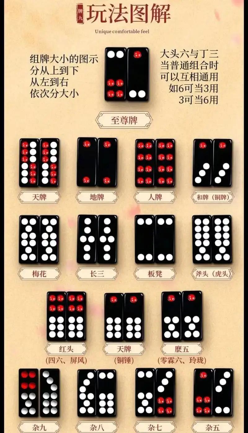 游戏使用一副32张骨牌,分为宫牌(如天、地、人、和等)、点牌(如红九、黑七、红六等)和么牌(如斧头、四六等)三类。特殊组合“响”(红六+红三)为最大牌型,但单独使用时反为最小。牌型等级由高至低依次为:响 > 宫 > 么 > 点。