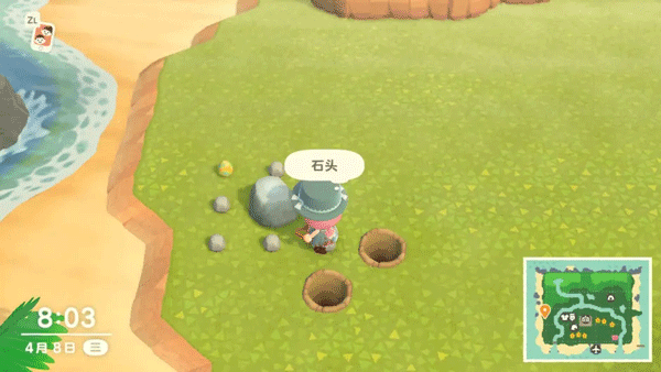 4、手持铲子,斜对石头连续按A,一直摁,可掉满8个道具