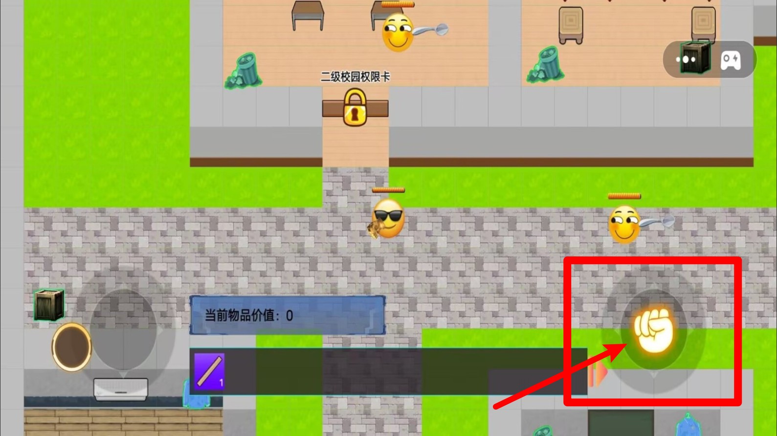 1.画面右下角显示拳头攻击按钮,玩家可以点击进行近战攻击,合理运用能有效对抗敌人并保护角色安全。