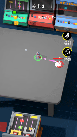 击败敌人会获得金币和各种道具,当机器人靠近时会自动吸取这些奖励。目标是消灭关卡内所有敌人即可通关。