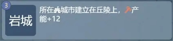 首先丘陵上建立城市,可以获得城防+3,受到攻击的时候可以减少20%左右的伤害,能获得不错的防守优势,丘陵还可以触发一个加产能的技能: