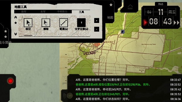 6、A排前往村庄,你可以通过发送相关无线电信息来确认A排所在位置,具体方法:打开无线电面板,选择单位>报告>位置,然后松开无线电按钮。