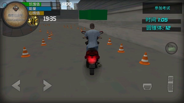 2、参加摩托车驾照考试时,控制摩托车在圆锥体间穿行,注意时间限制,保持行驶稳定,避免碰撞圆锥体,顺利通过考试。