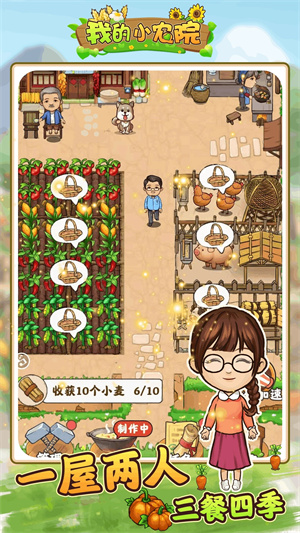 我的小农院赚钱版是一款以田园生活为主题的模拟经营类手机游戏。在这款游戏中,玩家将化身一名乡村农夫,亲手打理属于自己的小农院。通过种植各类农作物、饲养家禽牲畜,并将丰收的农产品进行售卖,逐步积累财富,拓展农场规模。