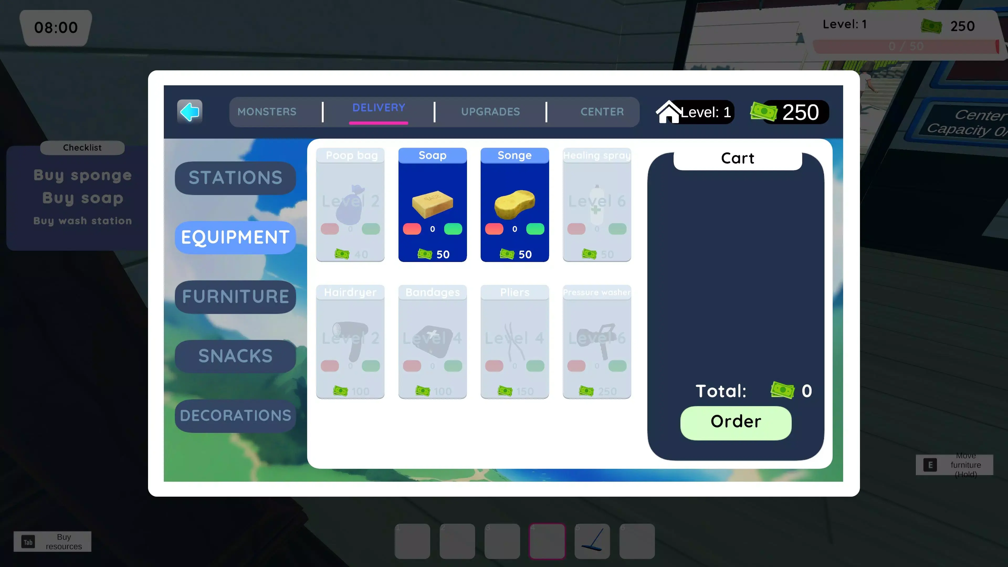 初期购买清洁台、肥皂等工具,接待脏污的怪兽客户,清洗后安置于庭院等待主人领回并获取报酬。
