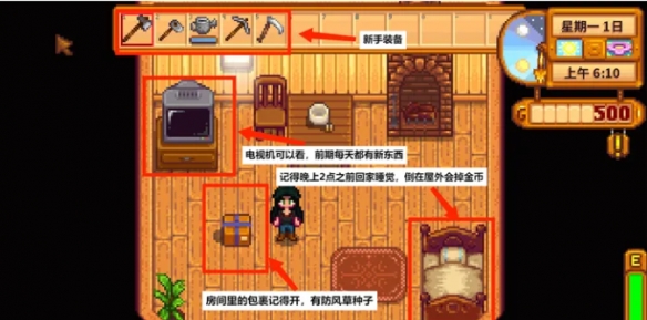 1、开局时你有的东西并不多,500金币,5个基本工具,15个防风草种子,一座废弃的农场,其他的就没了。