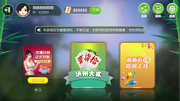 3、汇聚来自全国各地的牌技高手,在线切磋技艺,挑战强者赢取荣誉与奖励,提升你的排名地位。