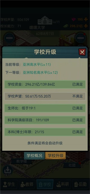 14.学校等级靠的是资金和声望,资金也是开六倍速怼就好,声望就特别难