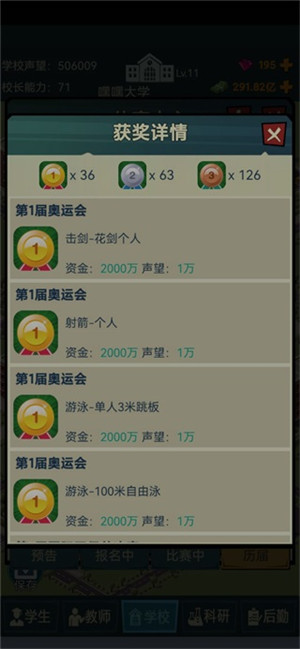 16.中期声望主要靠奖牌,一个奥运会金牌就送2000万奖金和10000声望,上面学校活动满级加起来送的声望还没这金牌高
