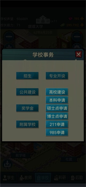 1、大学界面,游戏完全设计模仿了大学界面,可以查看所有的教学楼分布。