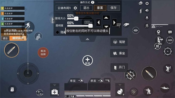 最后的操作模式,其实就是按钮位置大小,或者是载具的操作方式,这一点上各位萌新可以根据个人手机屏幕大小和自己实际操作舒适度来进行调校了。不过,小编建议按钮位置可以离手指近一些,方向键与开火键可以设置稍大一些方便触发。
