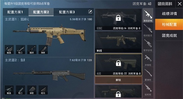 接下里,我们来认识一下团竞详情设置里最重要的一部分——“枪械配置”。在目前的游戏版本中,特种兵不需要在“出生点”去拾取枪械,而是使用自己已经搭配好的枪械配置。基本上特种兵在经典模式中可以使用的枪械在这里面都可以进行搭配,并且是全配件加持的。唯一需要注意的便是这里面的枪械需要事先进行解锁。解锁枪械的条件便是满足一定的团竞等级和消耗一定的军备点数。由于军备点数有限,所以特种兵在解锁枪械的时候一定认真考虑,选择自己擅长并且适合团竞模式的枪械进行解锁。