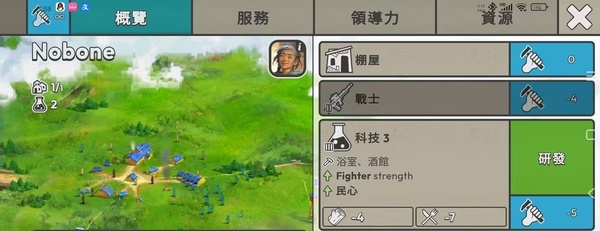 ③概览界面,这个界面是人口和科技和军队的界面,付出一定的行动力就可以选择升级科技和选择培养军队了。一定要注意的是,升级科技的时候要注意食物和木材是不是充足,尤其是食物。一个升级不好,整个冬天就崩掉了。