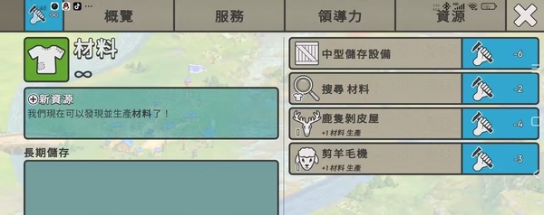⑦材料科技等级六解锁,在鹿和羊的身上获得。是裁缝店需要的,并且需要持续供应,和草药一样,一旦解锁了裁缝店,但是没有材料供应的话,这些人也会闹矛盾