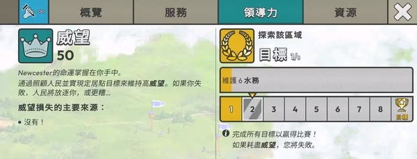 ①领导力,这个是游戏中比较重要的一个属性,如果降为零的话,直接游戏结束,降低的条件是首先没有定期完成目标任务,会持续降低。显示的是不耐烦。民心持续负数也会降低。而威望获得的标准,可以通过节日项目暂时增加和游戏中出现的选择,增加或减少。