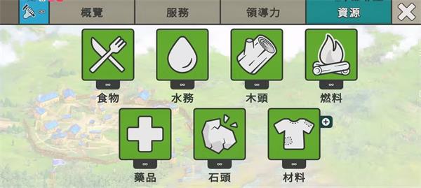 ④资源这个界面,是最重要的一个,毕竟游戏中能不能顺利的进行下去,都是靠这些资源支撑的,有些资源会定期消耗,比如说水资源,食物资源燃料资源和药品资源(升级治疗小屋后)材料(升级裁缝店后)而木头资源,石头资源,这两个资源属于是升级资源,少一点是没太大问题的,但是影响升级的速度。