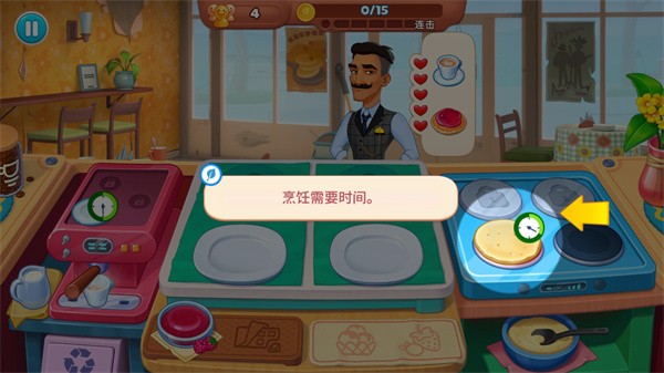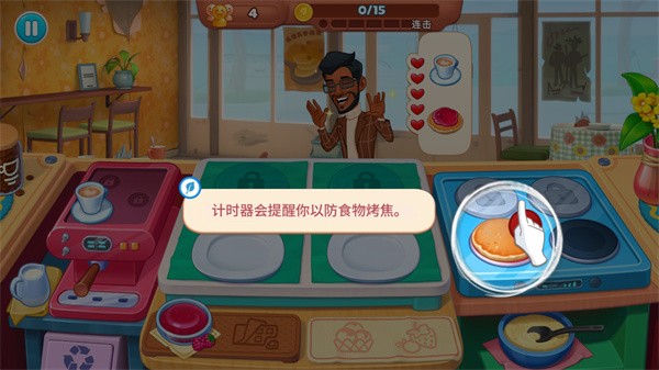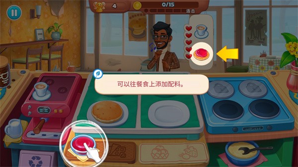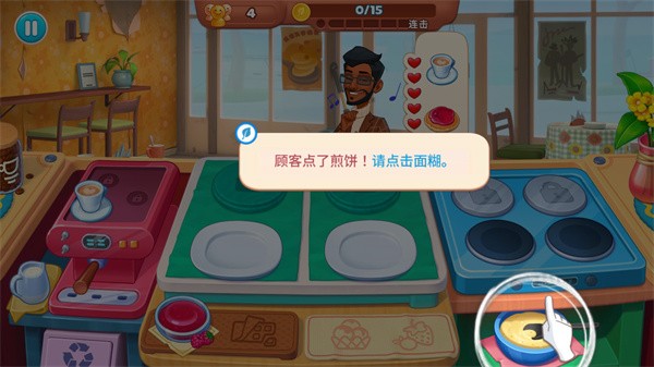 3、正式进入餐厅后,第一个顾客会点餐,例如煎饼,点击画面右下角的面糊即可开始烹饪。