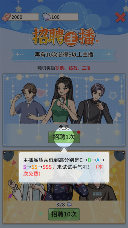 2、玩家可以根据自己的直播策略和目标受众来选择不同的主播,不同的主播在吸引粉丝、提高商品销量方面有着不同的效果。