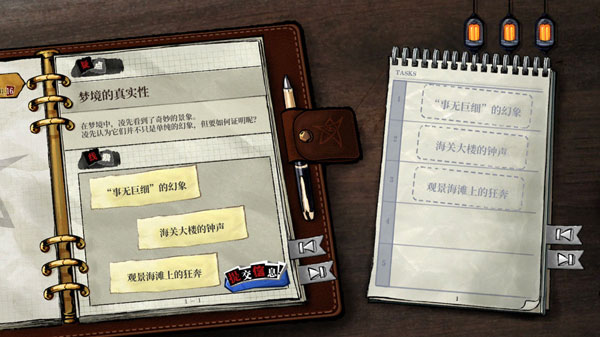 在故事推进中,通过对话、电视节目、****等各种途径都可以获取情报与疑点,各种情报会构成解决事件的关键线索。