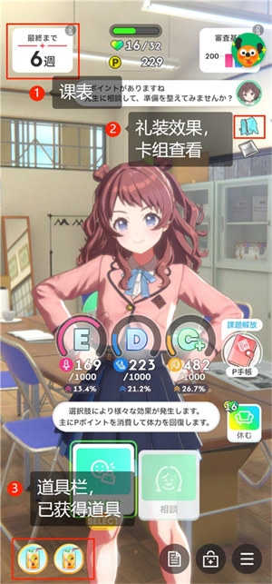 左上方是课表,这个不用多解释,后面会介绍。特训课程和比赛是固定的,一些机制会后面介绍。