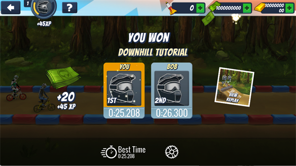 5、完成关卡后,你将获得金钱和经验奖励,同时可以查看自己与对手的用时,并选择【VIEWREPLAY】观看回放,复盘你的精彩表现。
