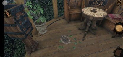9、回到过去,点击花盆右侧的椅子,先将小鸟浮雕向右拖拽,再拖拽画圈处滑块,点击得到罗马数盘