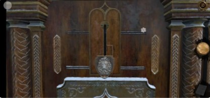 19、调好后门会上锁,再对应石椅上的提示调好指针(这里注意对门眼睛的视角)