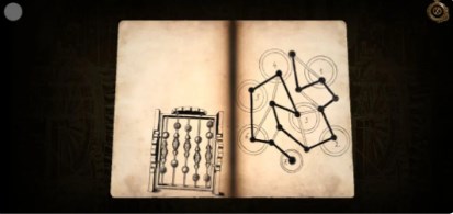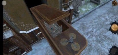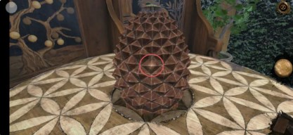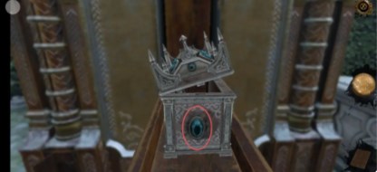7、然后开启第二道机关,先向右翻转,再向下翻转机关(这里将机关上小球对应后方椅子上较亮的球即可)