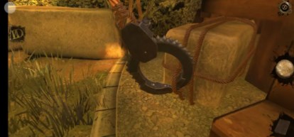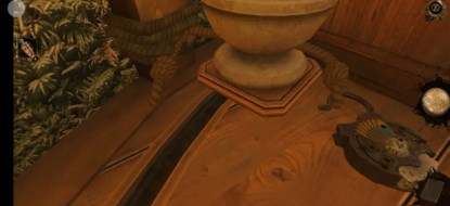 10、回到现在,将画面左转,拖拽左侧机关上方的金属旋钮,再将罗马数盘放置在上面