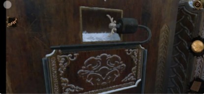 20、然后先解开铁笼门上的机关,点击得到门内侧的旋钮,再将旋钮插入笼子上插口处