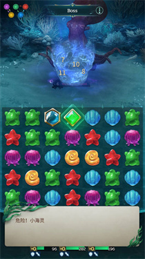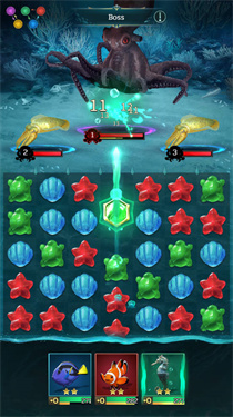 2、你可以在与敌人的战斗中,通过消除拼图的方式,释放技能、攻击敌人,增加战斗的乐趣和挑战。掌握消除技巧,打败所有敌人,成为海底的霸主!